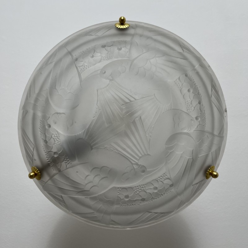 Description : Vasque Art Deco en verre pressé. Décor aux perruches. Suspentes, fil et cache fil plus recents.
