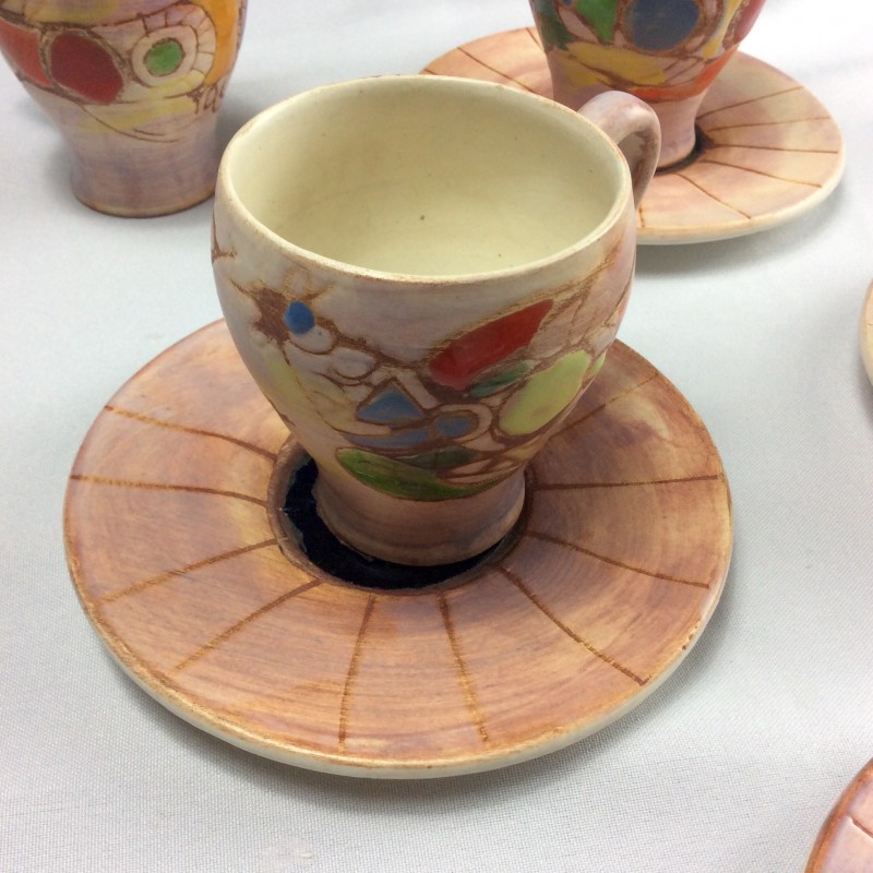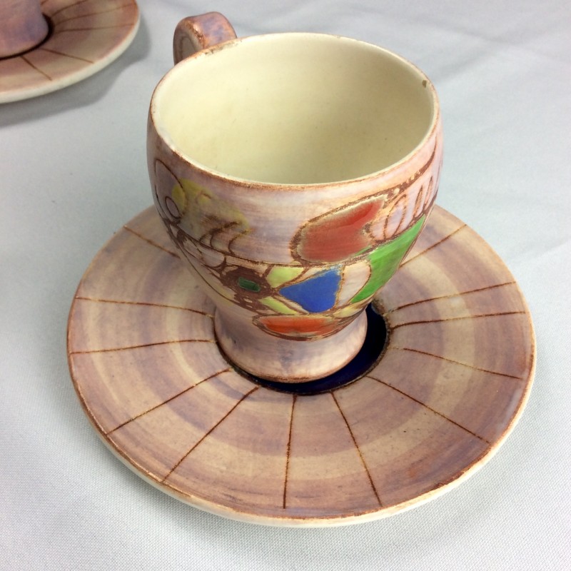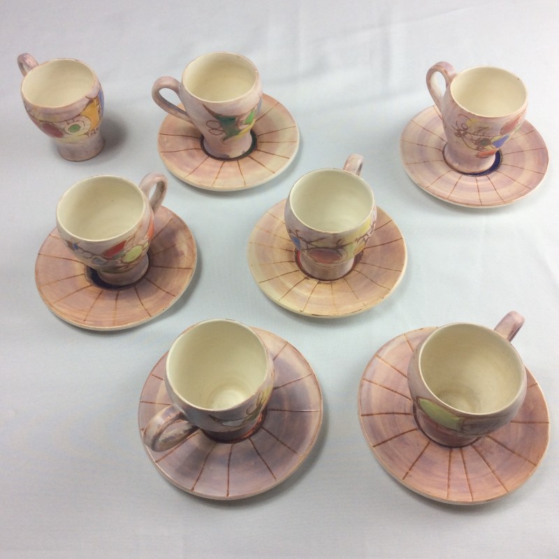 Bel ensemble. Rare sur le marché. 7 tasses au modèle accompagnées de 6 soucoupes. Décor caractéristique de l’artiste. Ensemble en très bon état. 3 petites egrenures discrètes à signaler.