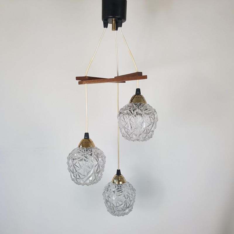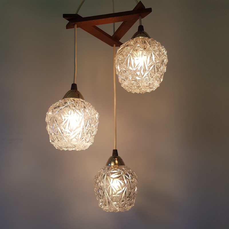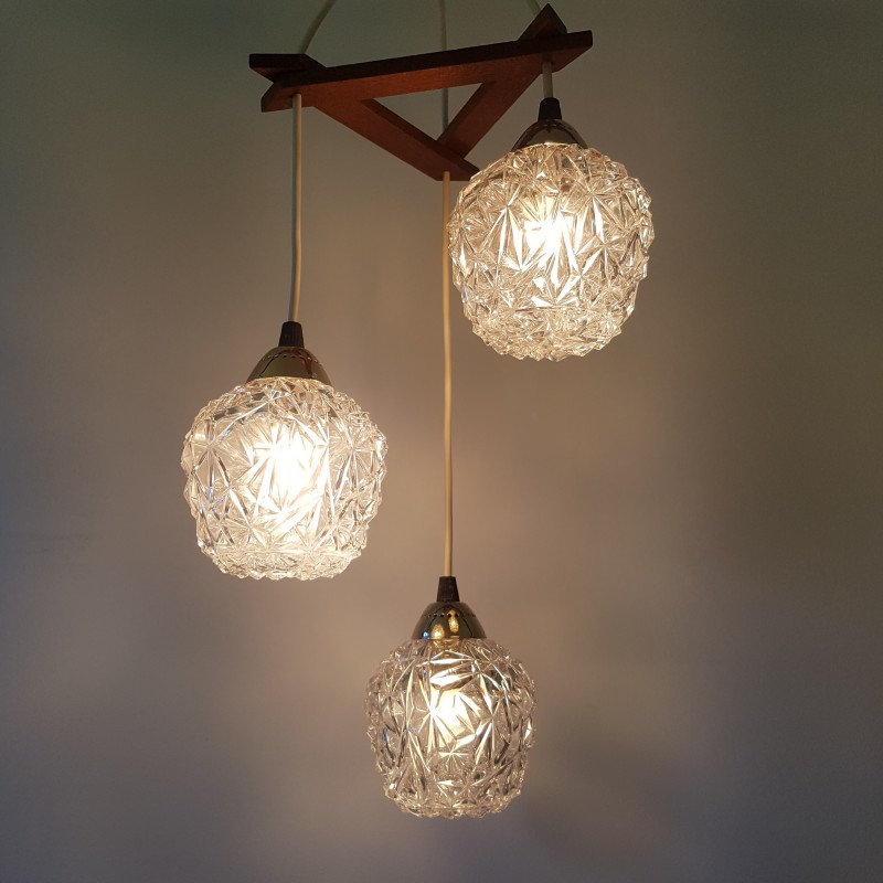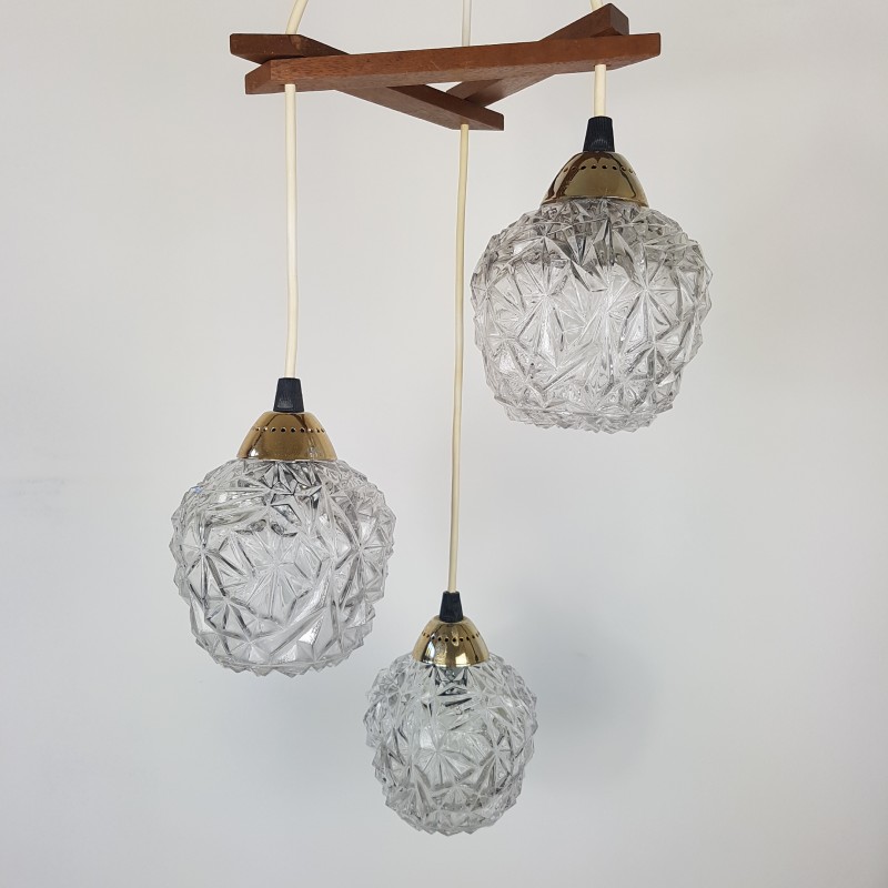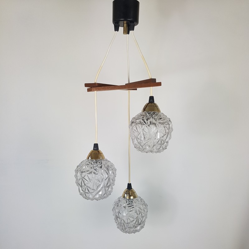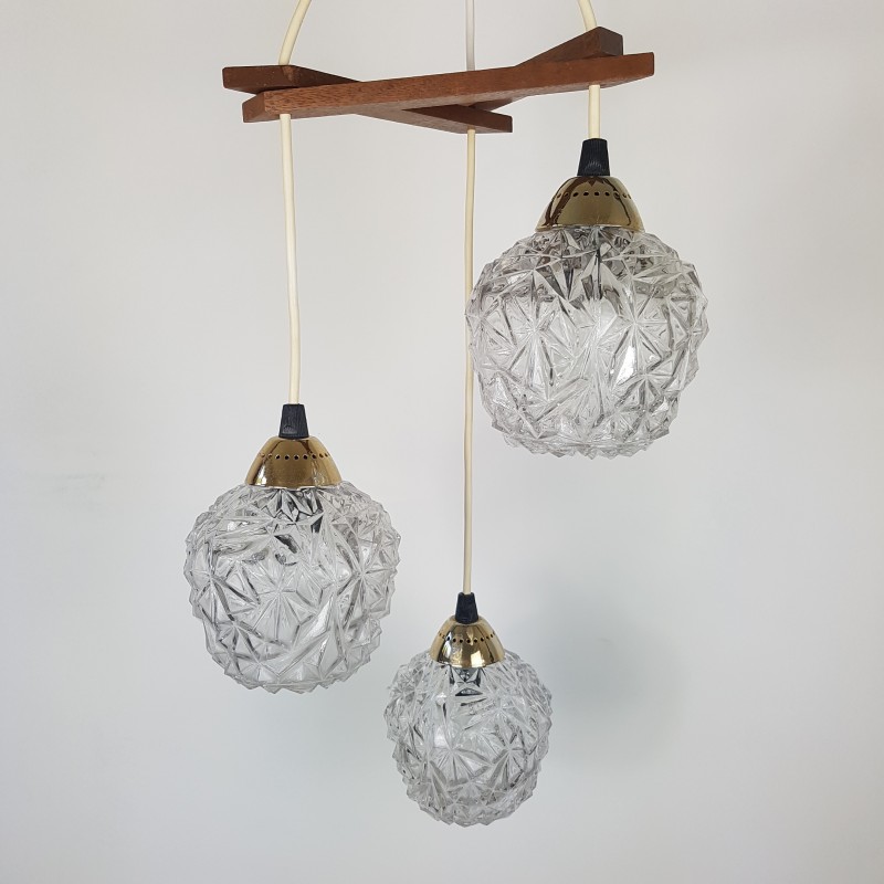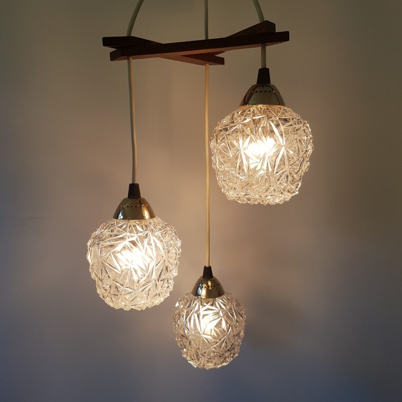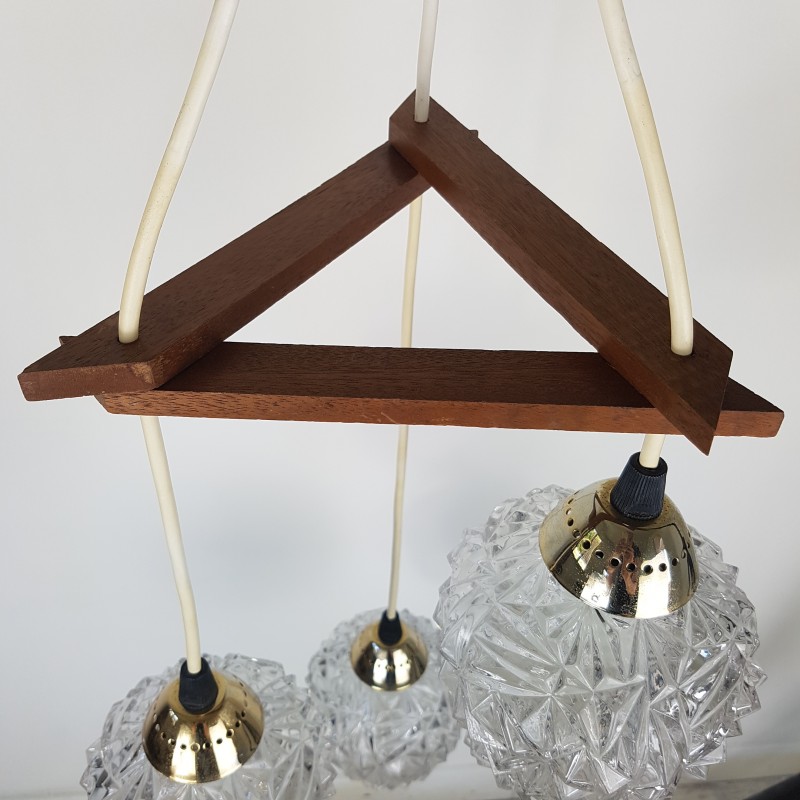 Joli lustre 3 feux de style scandinave. Globes épais a motif de diamant, acier doré, noir mat et structure en teck. Bel état d'usage. Légère patine sur l'acier doré et le cache fil noir mat. Bel effet allumé.