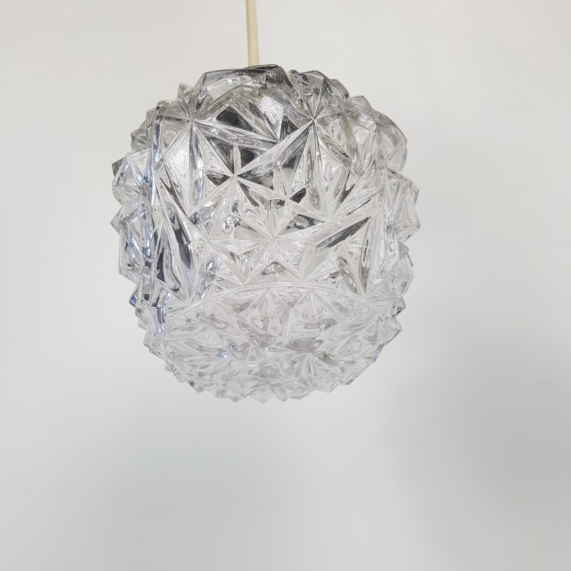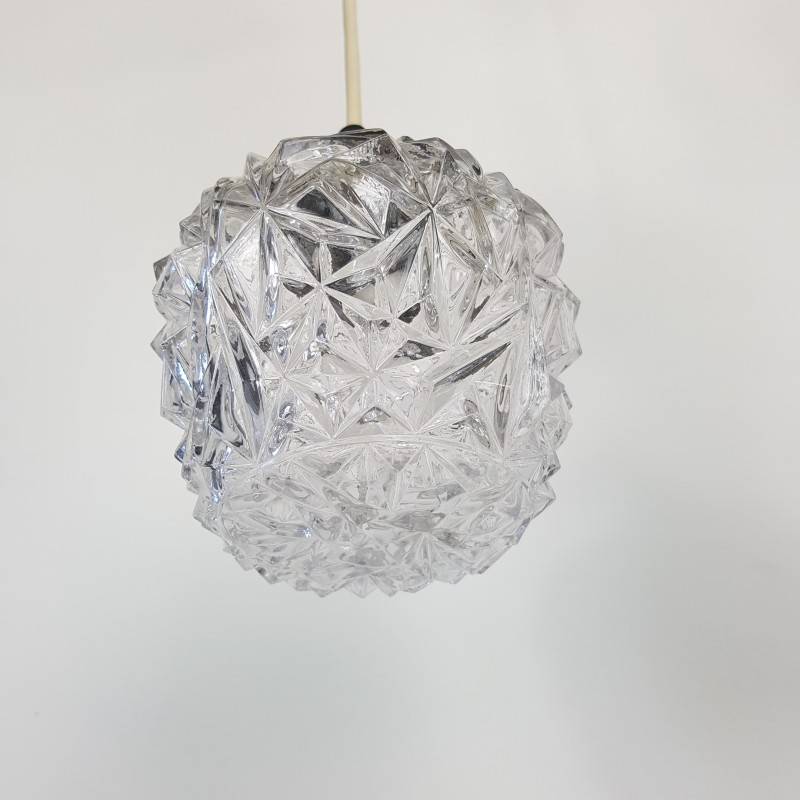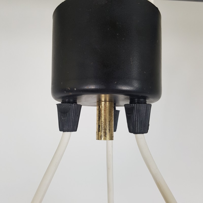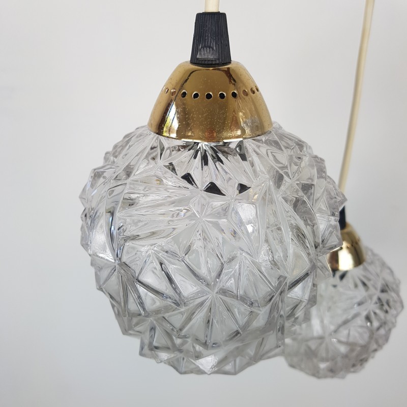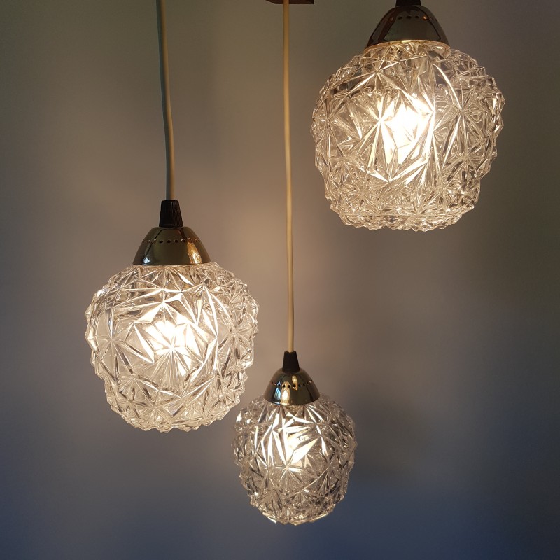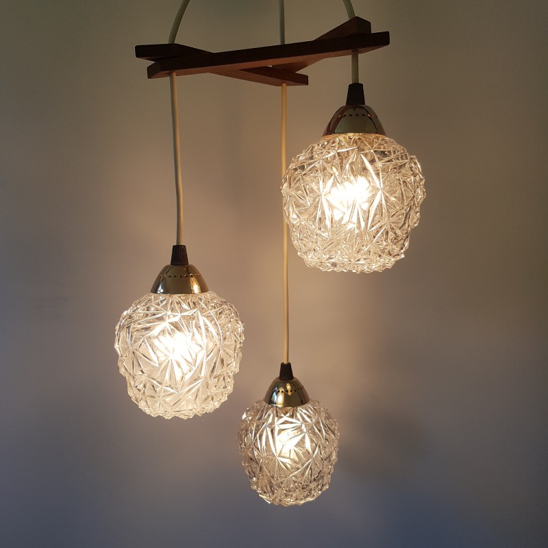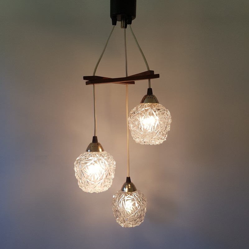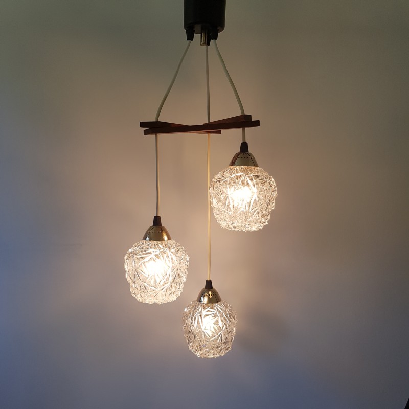 Joli lustre 3 feux de style scandinave. Globes épais a motif de diamant, acier doré, noir mat et structure en teck. Bel état d'usage. Légère patine sur l'acier doré et le cache fil noir mat. Bel effet allumé.