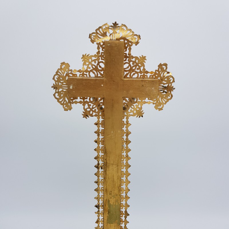 Description : Superbe crucifix ancien probablement 19e en bois stucé doré, biscuit et métal doré.